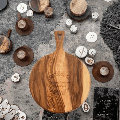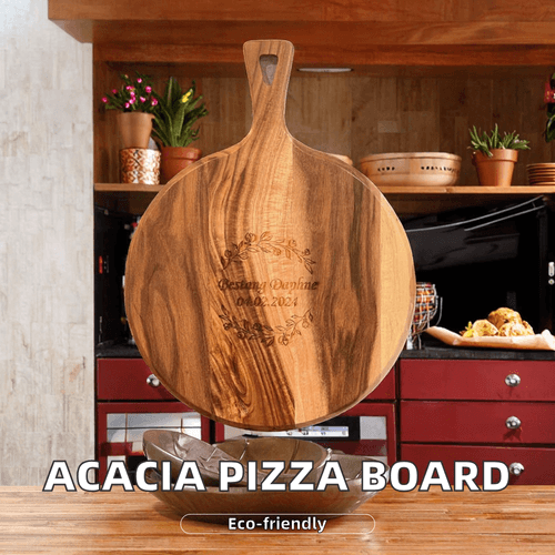 Bring style, sustainability, and practicality to your kitchen with this exquisite Acacia Wood Pizza Board.